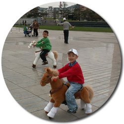一次我带外孙去儿童乐园,外孙骑在木马上总想让木马跑起来,我一下想到木牛流马。试想一个三、五岁的儿 童骑在一个玩具马上,在公园来回奔跑一定非常好。我把想法对女儿及外孙一说,他们都非常高兴,于是,我用了一年时间做出了第一匹"木牛流马"。可是谁知待外孙第二年春节来试骑的时候,这匹马只走了一步,第二步怎么也走不动了。